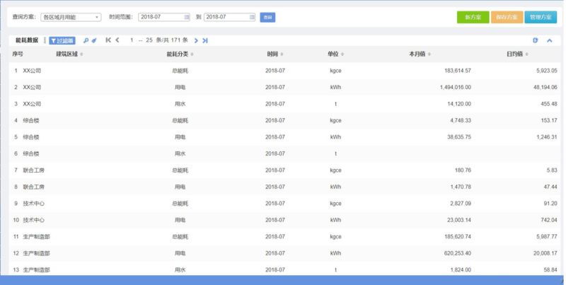功能介绍:满足用户对企业各区域能耗的历史数据进行多角度查询的需要,允许用户自行定制查询条件(包括自定义区域、自定义能耗类型、自定义时间频率、自定义数据类型等),并支持自定义查询方案的编辑,手动录入和自动计算的数据都在查询的范围之内。