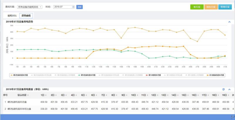 从界面中我们可以看到,此界面以折线图和数据列表的形式向用户展示所选设备的某一能耗分类本期值和同期值的对比分析。